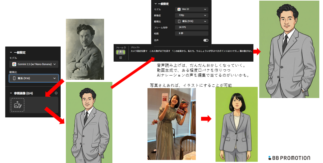 ・うまく喋らないカメラのアングルが変わる、人物が動くなど運次第でうまく生成ができない可能性がある。
